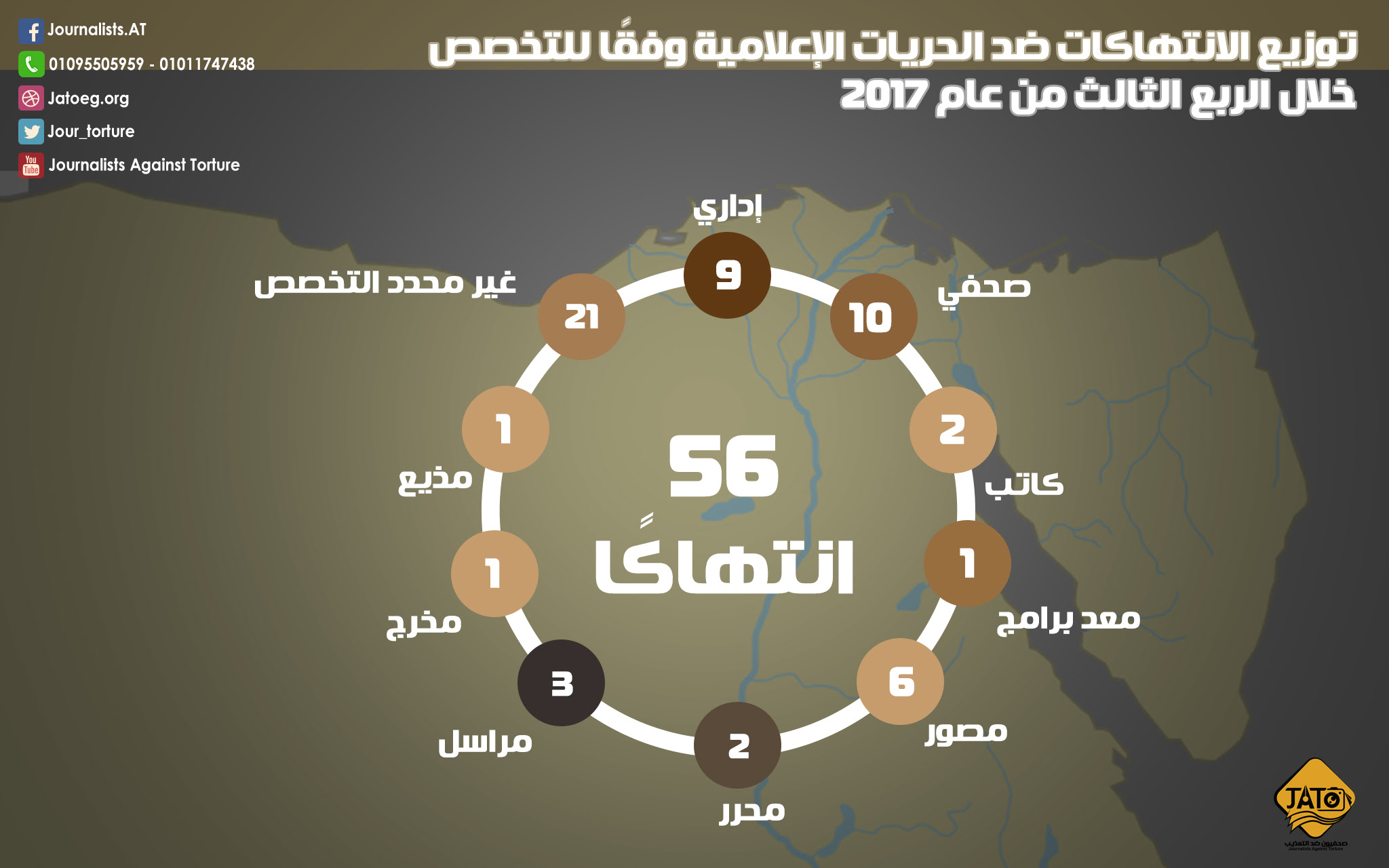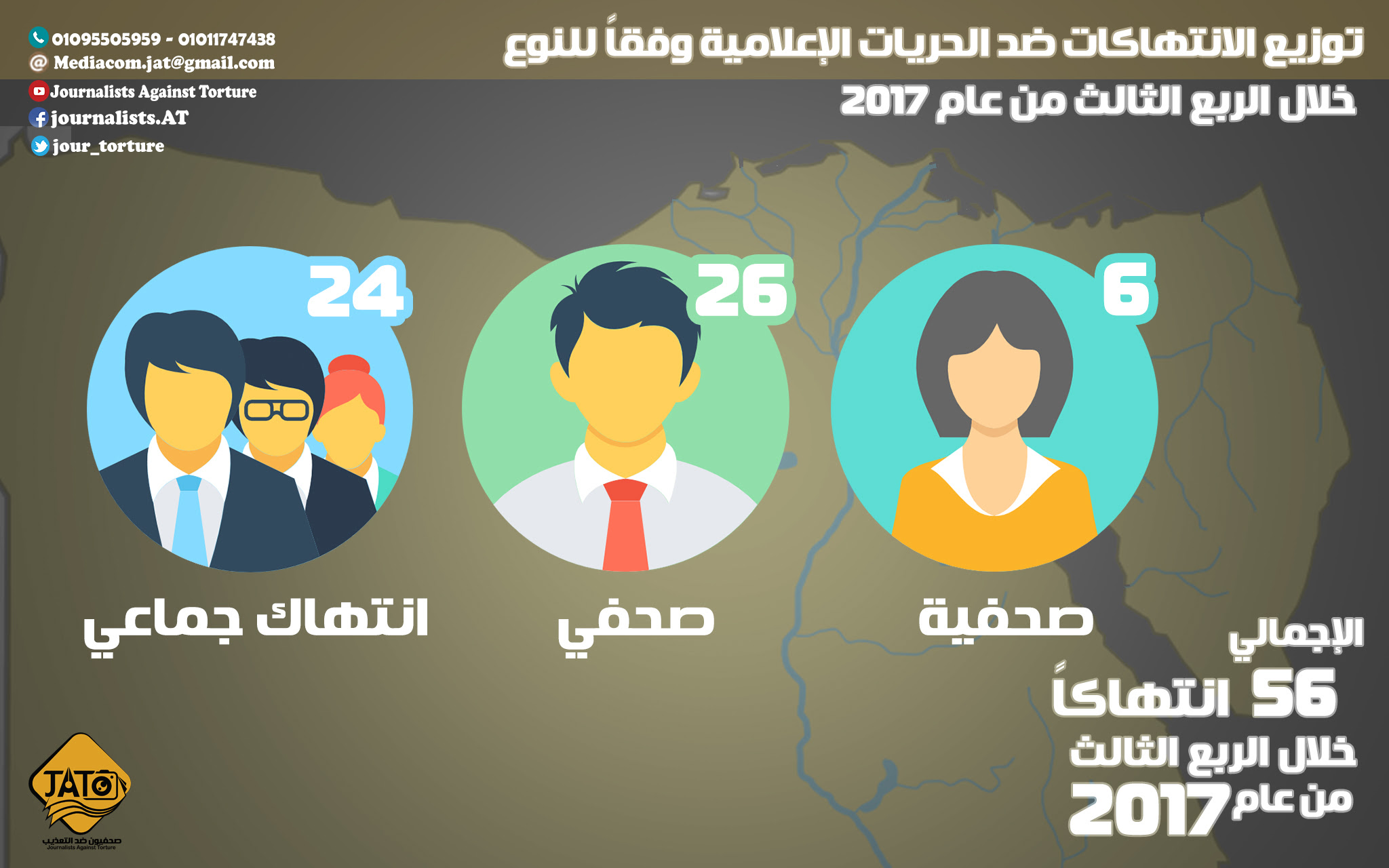 قام مرصد "صحفيون ضد التعذيب"، برصد وتوثيق 56 انتهاكا ضد الصحفيين والإعلاميين في بعض محافظات مصر أثناء تأدية عملهم خلال الربع الثالث من عام 2017 (تموز/ يوليو– آب/ أغسطس – أيلول/ سبتمبر) إذ سجل تموز/ يوليو 15 انتهاكا، وسجل آب/ أغسطس 23 انتهاكا، ليصبح بذلك أكثر الأشهر الثلاثة تسجيلا للانتهاكات، يليه أيلول/ سبتمبر بـ 18 انتهاكا.