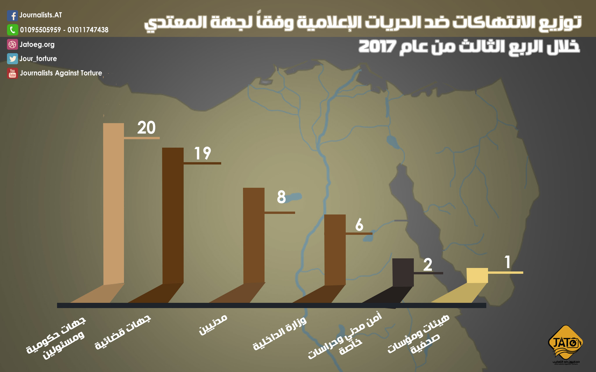 وتصدرت "جهات حكومية ومسؤولين"، قائمة المعتدين على الصحفيين في الربع الثالث من عام 2017، إذ سجل المرصد 20 انتهاكا من قبلهم، ويليهم 19 انتهاكا من جهات قضائية، و8 انتهاكات من "مدنيين"، و6 انتهاكات من وزارة الداخلية، وانتهاك واحد من هيئات ومؤسسات صحفية، وانتهاكين آخرين من أمن مدني وحراسات خاصة.
