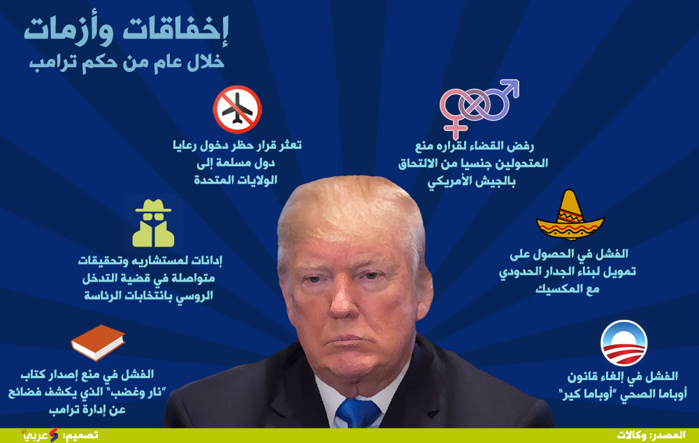 اتسم العام الأول من حكم الرئيس ترامب بحدوث العديد من الإخفاقات والأزمات الداخلية وتعثر العديد من القرارات التي اتخذها وتصدى القضاء لبعضها.