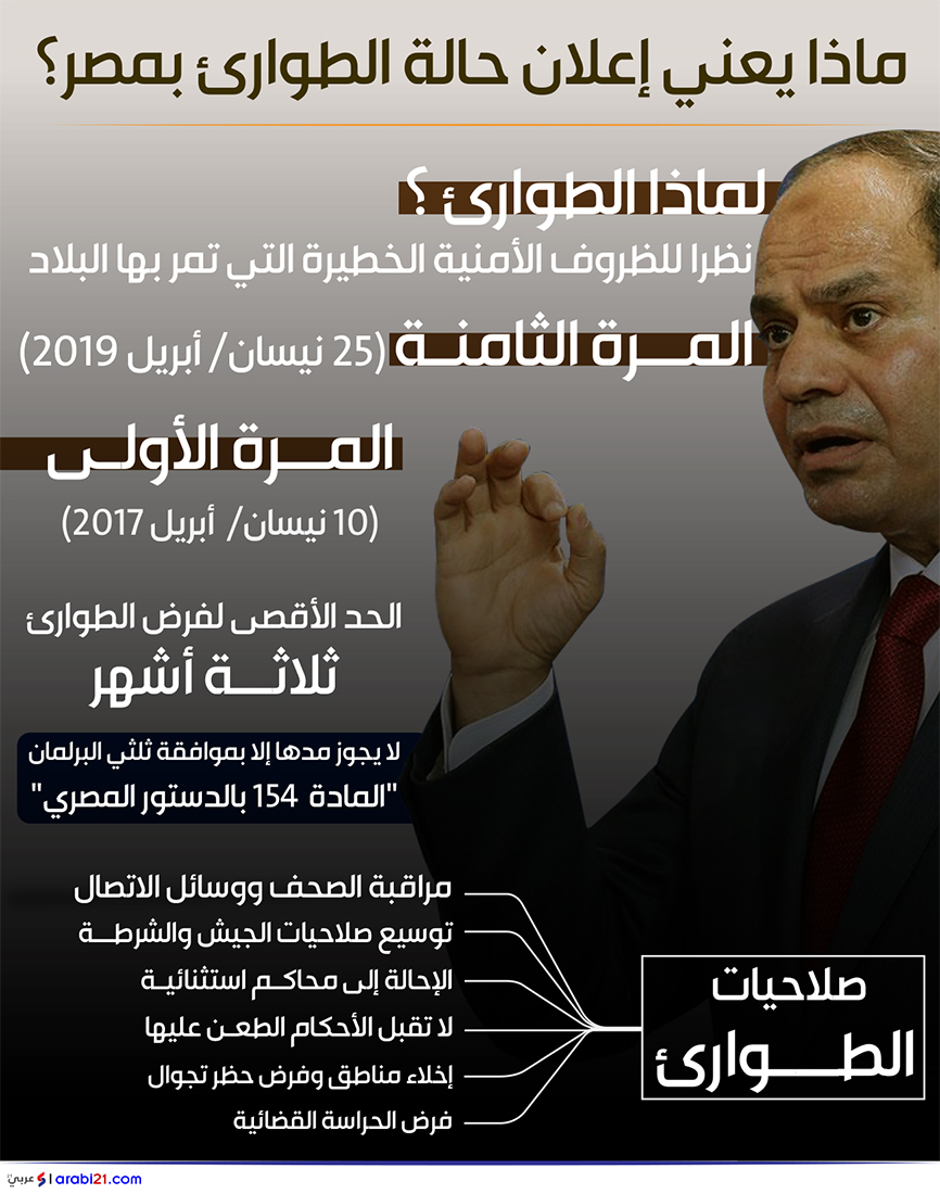 أعلن رئيس سلطة الانقلاب، عبدالفتاح السيسي، حالة الطوارئ في عموم البلاد، لمدة ثلاثة أشهر، تبدأ من الخميس 25 نيسان/ أبريل.