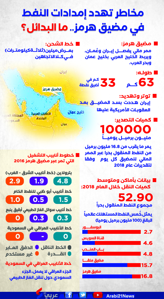 ومع التصعيد الأخير بين إيران والولايات المتحدة الأمريكية في الخليج، برزت الأهمية لهذا المضيق وفي ذات الوقت الخطوة التي تتهدده، وهو ما يوضحه الإنفوغراف التالي: