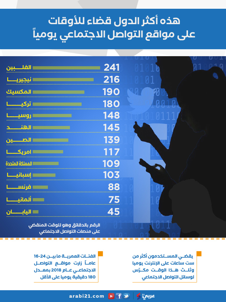 الإنفوغراف التالي يوضح الأوقات التي يقضيها الفرد الواحد يوميا على منصات التواصل الاجتماعي في بعض الدول:
