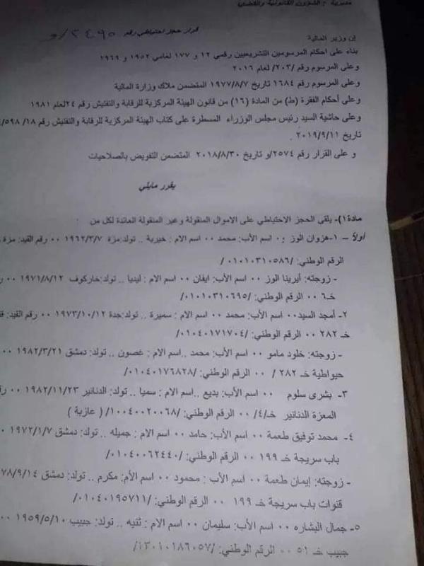 على أموال المنقولة وغير المنقولة لوزير التربية السابق هزوان الوز وزوجته إيرينا الوز".