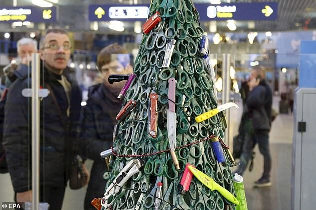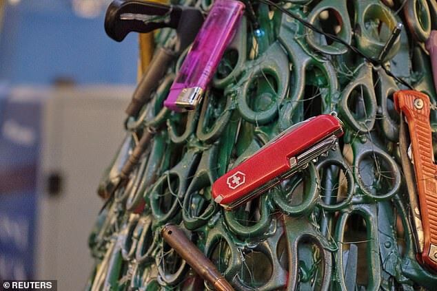 "الشجرة مصنوعة من مواد مصادرة من المسافرين في المطار، بما في ذلك الشفرات