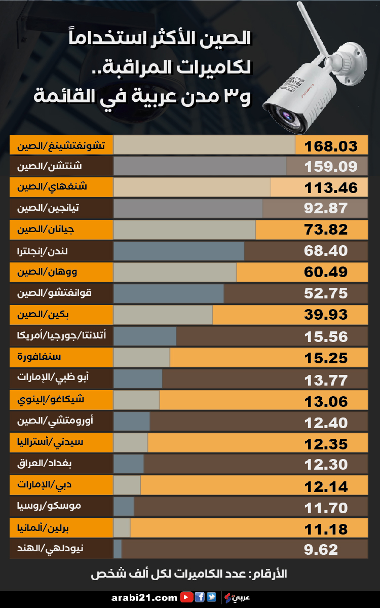 جمع باحثو شركة كومباريتيك عددا من موارد البيانات والتقارير، بما في ذلك التقارير الحكومية ومواقع الشرطة والمقالات الإخبارية، للتعرف على عدد الكاميرات المستخدمة بتقنية (سي سي تي في) المستخدمة من قبل الجهات الحكومية والأمن في 120 مدينة رئيسية بجميع أنحاء العالم بناء على عدد الكاميرات لكل ألف شخص وخلصوا إلى ما سينشره الإنفوغراف الآتي: