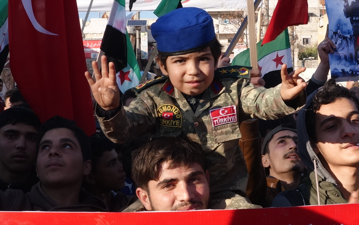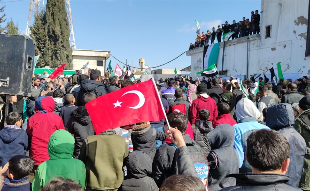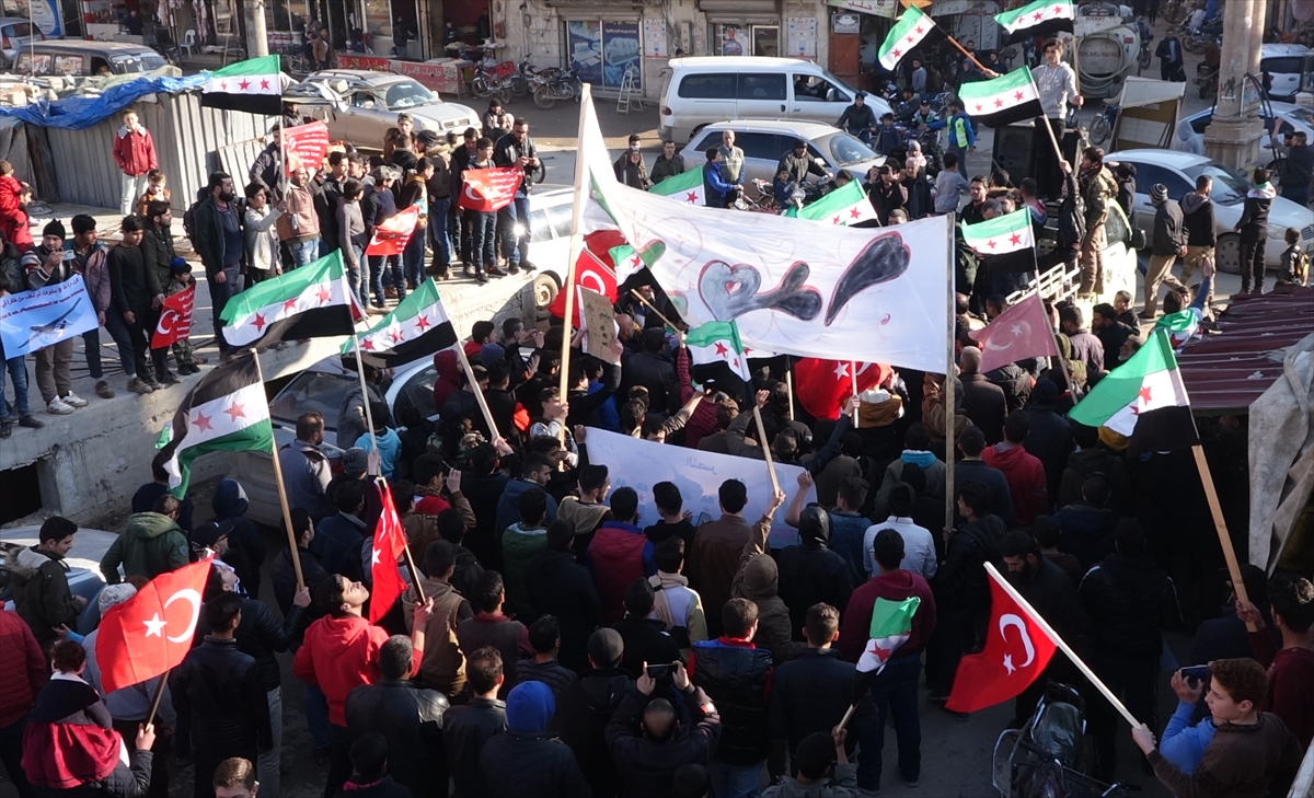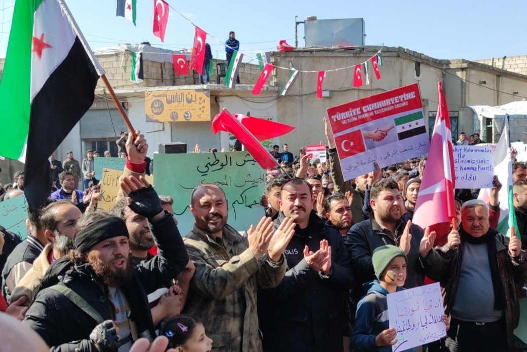 ورفع المتظاهرون أعلام تركيا والثورة السورية، مطلقين شعارات داعمة لتركيا وقواتها المسلحة، ومناهضة للنظام السوري، وروسيا وإيران.