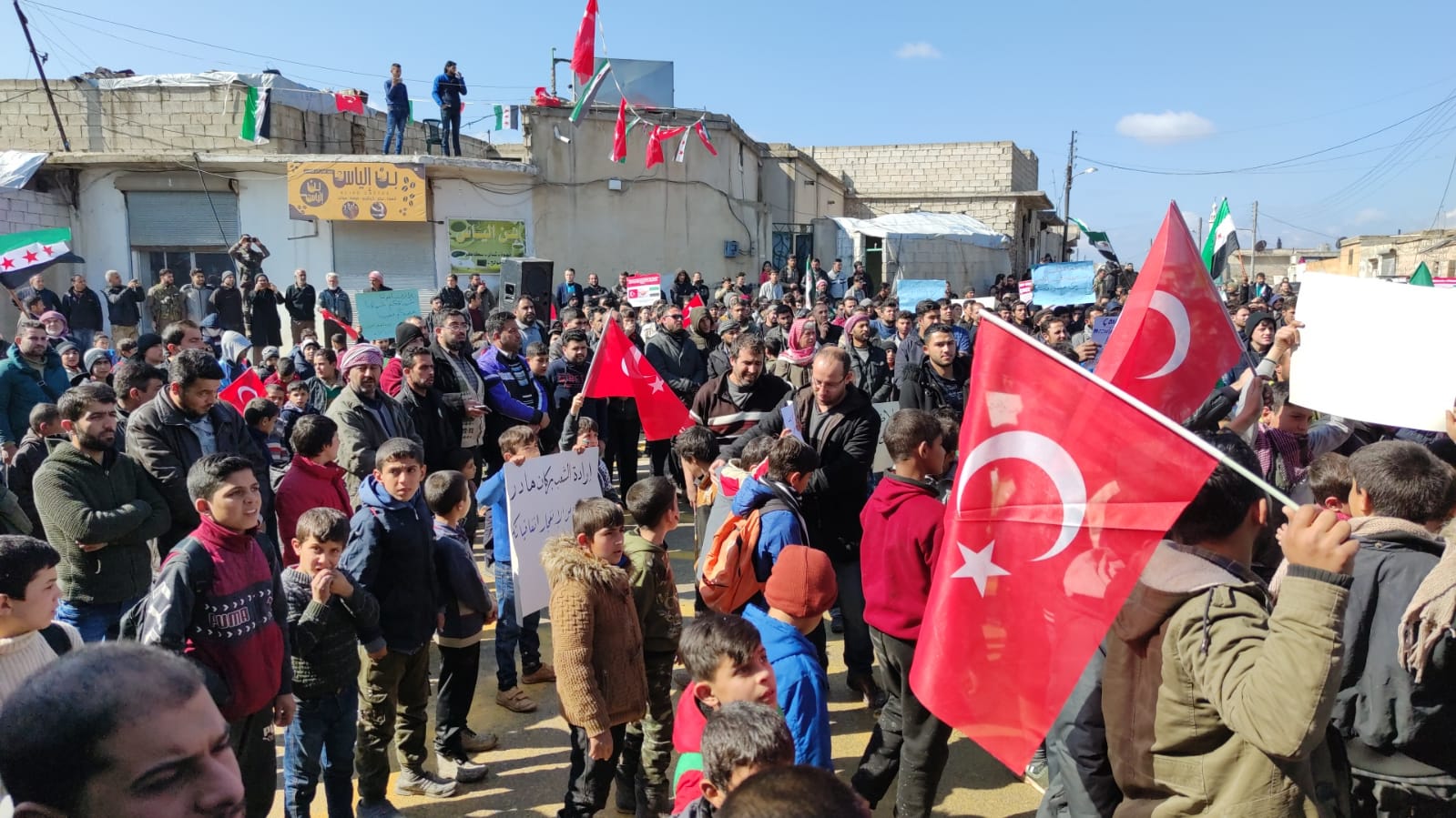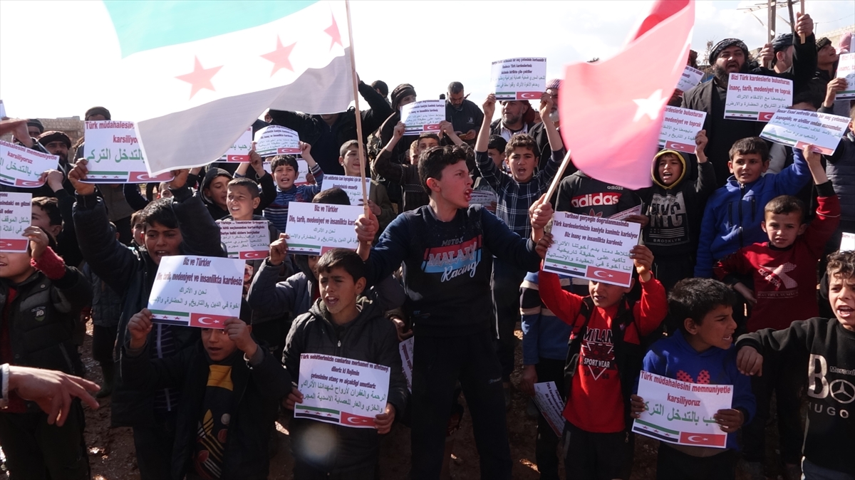 كما رفع المتظاهرون لافتات كتب عليها باللغتين العربية والتركية: "لأول مرة منذ 9 سنوات نرى مقاتلات في الجو ولا نخشاها"، و"نرحّب بالتدخل التركي" و"نحن والأتراك إخوة في الدين والتاريخ والحضارة والإنسانية".
