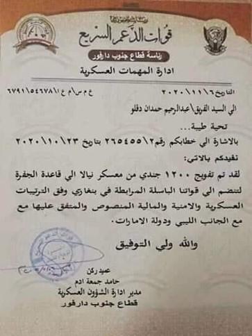 وبحسب الوثيقة التي كشفت عنها المصادر الأمنية، فإن دقلو أمر إدارة المهام العسكرية في إقليم جنوب دارفور، بتجهيز 1200 جندي بتاريخ 23 تشرين الأول/ أكتوبر الماضي، فيما أكد العميد الركن حامد جمعة آدم مدير إدارة الشؤون العسكرية في دارفور تلبية الطلب، وإرسال قوات من معسكر نيالا إلى قاعدة الجفرة في ليبيا.