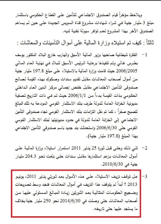 وأوضح التقرير أنه في عهد الرئيس المخلوع حسني مبارك، وزير المالية الأسبق والهارب خارج البلاد يوسف بطرس غالي في نهاية العام المالي 2005/ 2006، قامت وزارة المالية بالاستيلاء على مبلغ 197.8 مليار جنية من أموال أصحاب المعاشات مقابل تقديم سندات وصكوك بهذه القيمة لصالح صندوقي التأمين الاجتماعي مقابل خفض إجمالي مركز الدين العام الداخلي الحكومي بذات القيمة بدءاً من كانون الثاني/ يناير 2006.