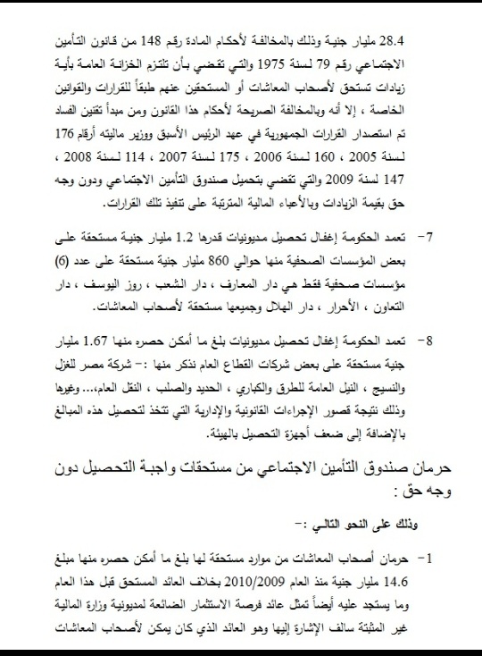 وقال البلاغ إنه كان يتعين عدم التعدي على هذه الأموال أو الأرباح المترتبة عليها خلال استثمارها بالطريقة التي كانت تدار بها هذه الأموال قبل استدانتها من وزارة المالية إبان دمج وزارة المالية والهيئة القومية للتأمين الاجتماعي لصندوقيها تحت قيادة وزير المالية الأسبق يوسف بطرس غالي.