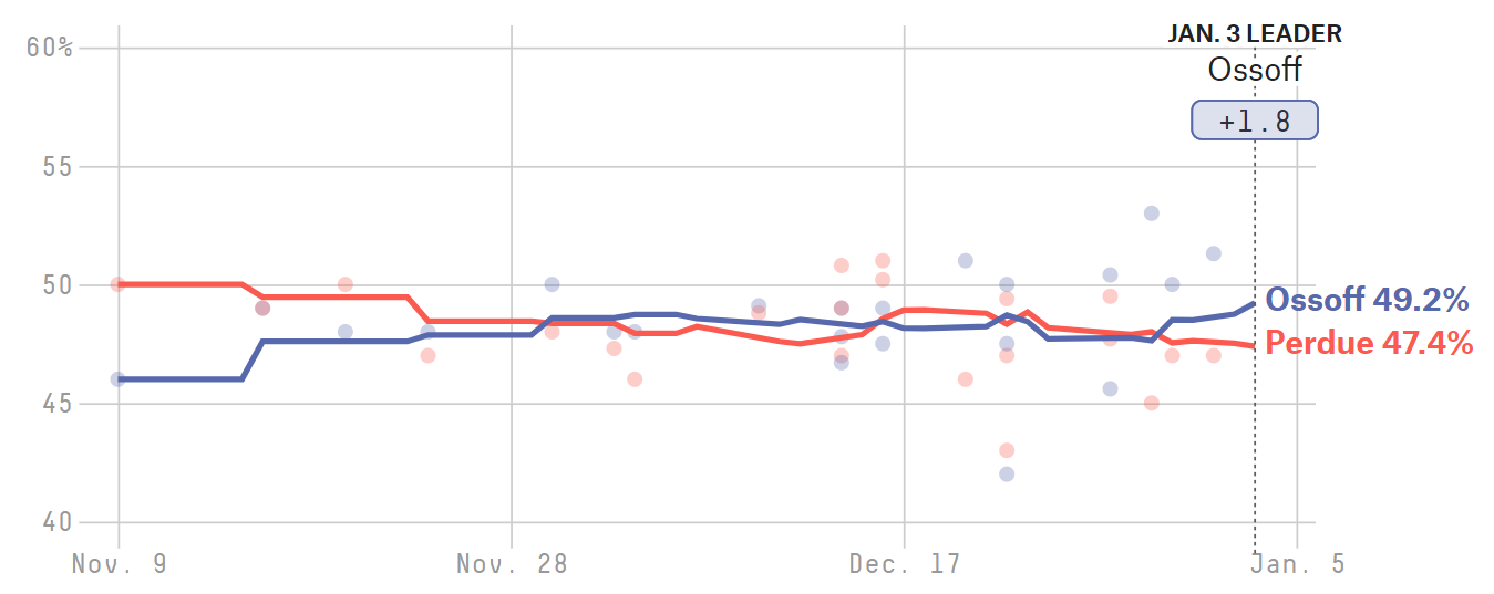 ولم يتم في الثالث من تشرين الثاني/ نوفمبر حسم الفائز بمقعدي جورجيا في مجلس الشيوخ، وهما اللذان سيحسمان من ينتزع الأغلبية فيه، وسط تقديرات بأن يتمكن الديمقراطيون من تحقيق إنجاز تاريخي بالسيطرة على غرفتي الكونغرس، فضلا عن البيت الأبيض.