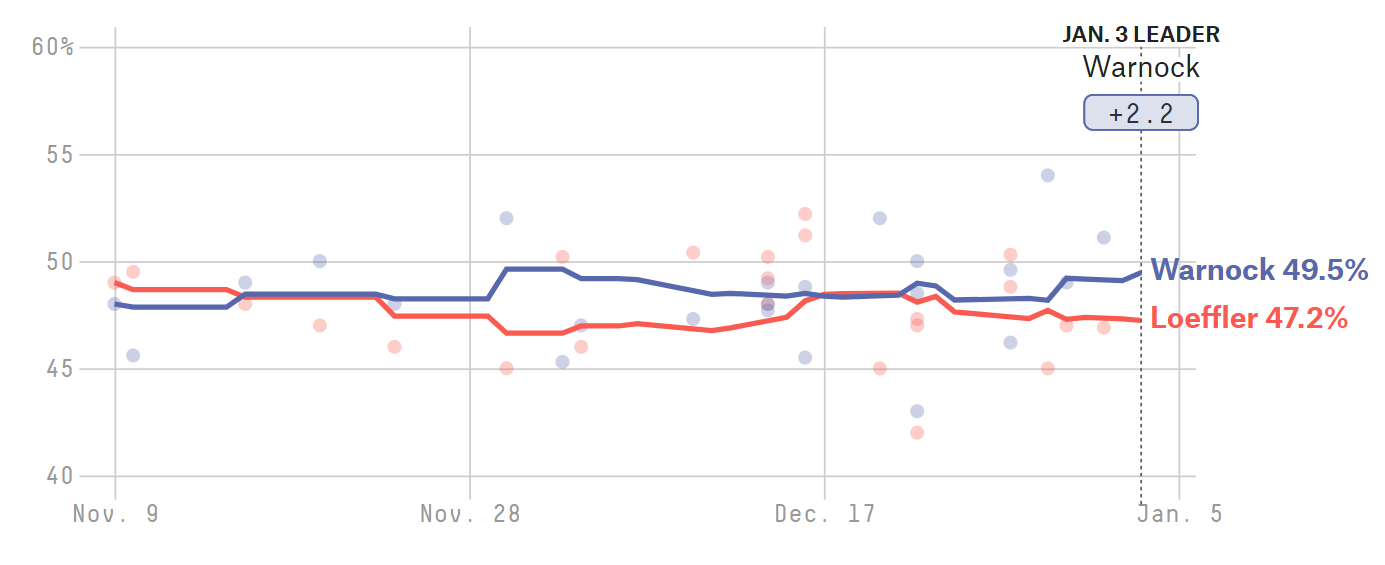 وبحسب معدل عدة استطلاعات رأي، نشرته منصة "فايف ثيرتي إيت"، فإن أوسوف بات الآن متفوقا بواقع 1.8 نقطة، فيما يتقدم زميله الديمقراطي الآخر، وارنوك، بأكثر من نقطتين.