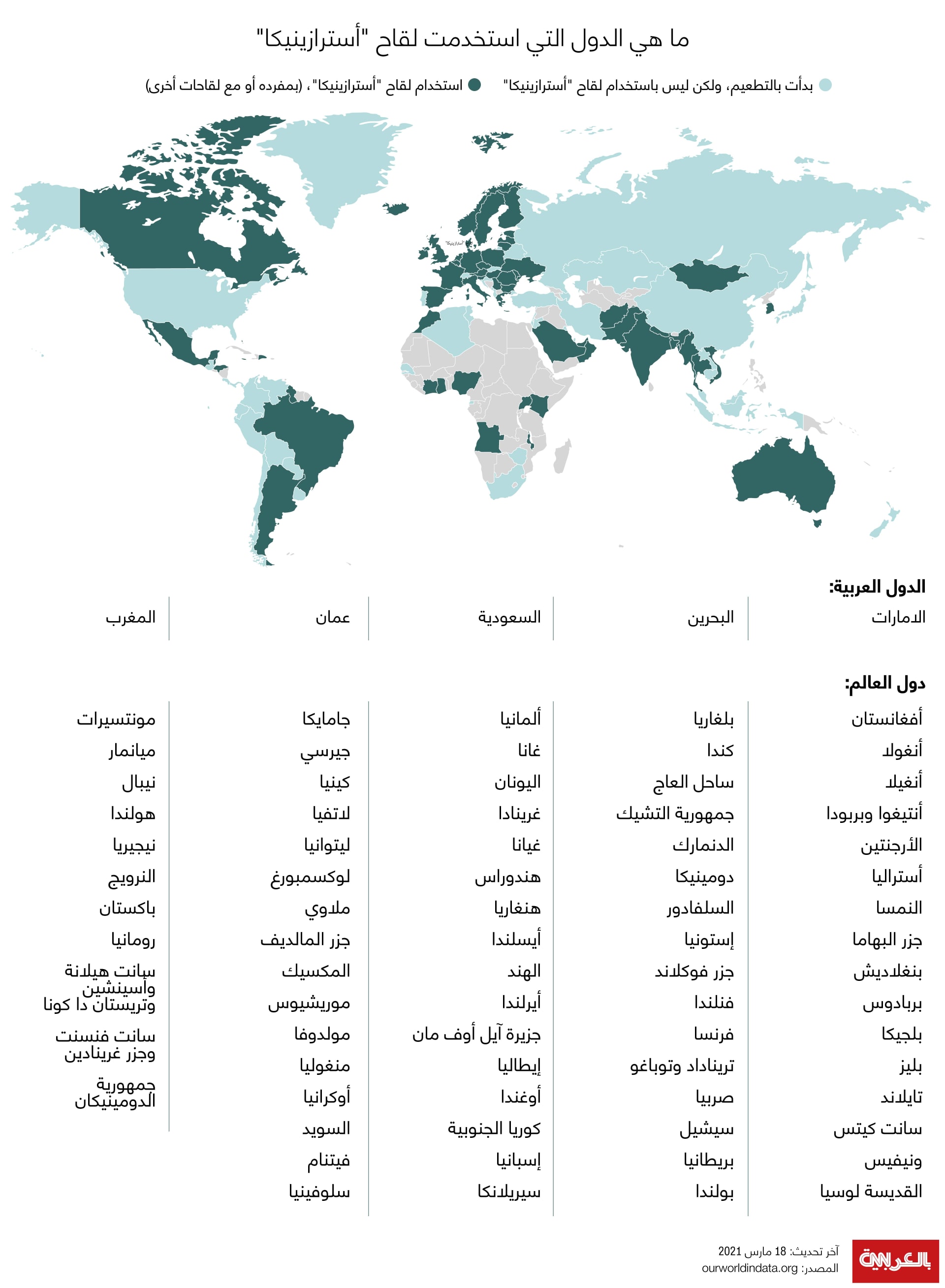 ويظهر الإنفوغراف التالي الدول التي استخدمت لقاح "أسترازينيكا" بحسب إحصائية لـ"سي أن أن":