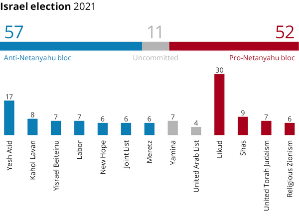 وحزب يمينا بزعامة نفتالي بينيت، تستحوذ على 59 مقعدا فقط من مقاعد الكنيست البالغ