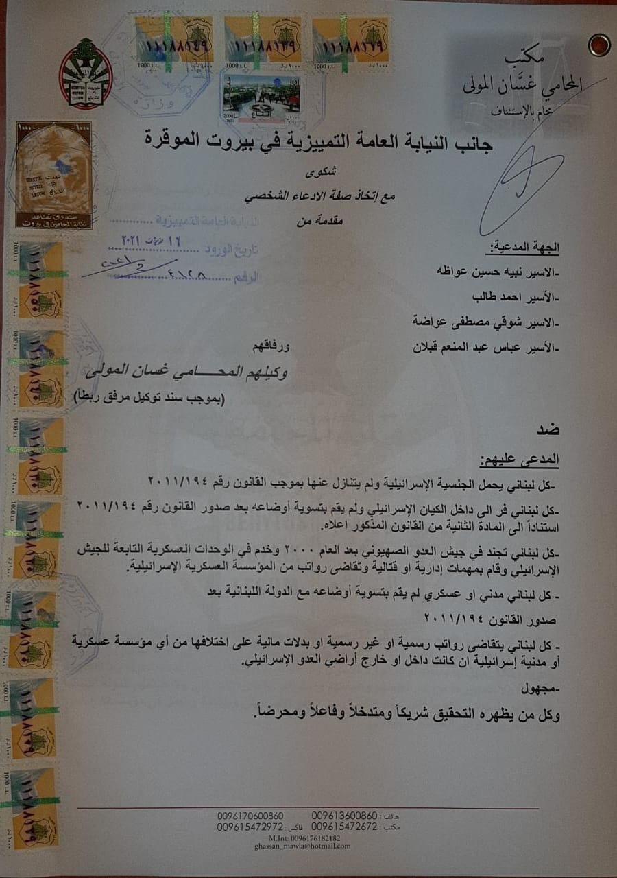 وقدم المحامي غسان المولى بوكالته عن عدد من الأسرى المحررين من سجون الاحتلال بجنوب لبنان، دعوى قضائية اتخذوا فيها صفة الإدعاء الشخصي لدى النيابة العامة التمييزية ضد كل لبناني يحمل الجنسية الإسرائيلية ولم يقم بالتنازل عنها استنادا الى القانون اللبناني.