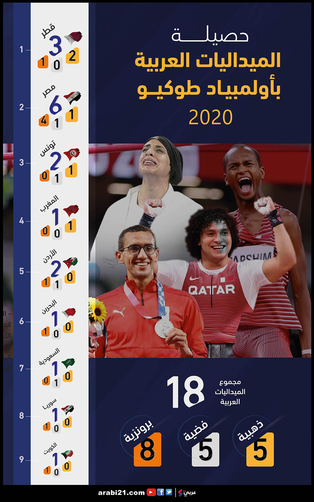 وحتى آخر يوم من المنافسات أضاف لاعبو مصر والسعودية والبحرين المزيد من الميداليات للحصيلة النهائية للميداليات العربية في الأولمبياد، والتي نستعرضها في الإنفوغراف أدناه: