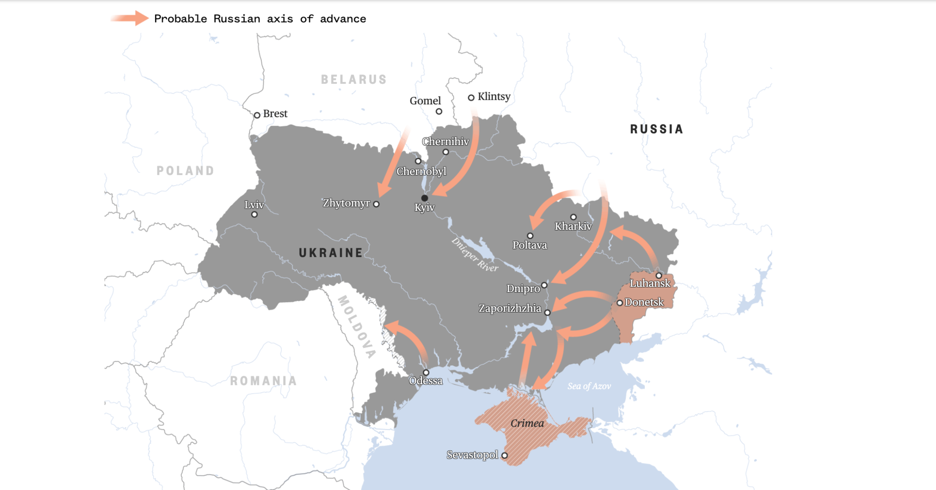 وبحسب السيناريو الأول، ستجتاز دبابات ومدرعات روسية الحدود وستتقدم نحو مدينتي بولتافا وخاركيف لتطويقهما، بينما ستتقدم القوات البرية بثلاثة مسارات من منطقة دونباس بالاتجاهين الشرقي والجنوبي، نحو شبه جزيرة القرم، بغية السيطرة على ساحل بحر آزوف، في حين ستشن مروحيات عسكرية هجوما جويا من القرم.