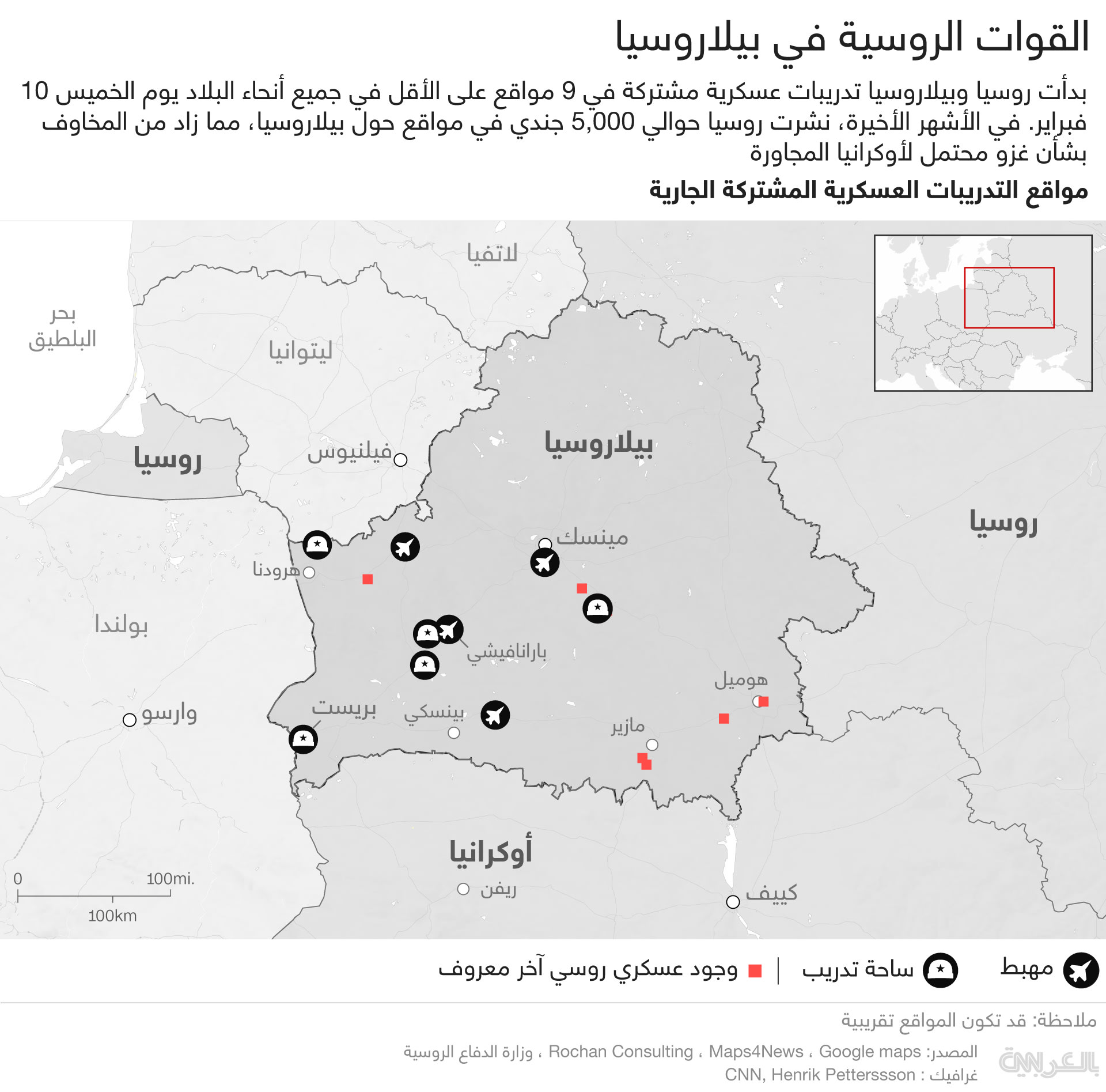 فيما تجري التدريبات العسكرية في جميع أنحاء بيلاروسيا، بما في ذلك "ساحات تدريب دومانوفسكي، وجوزسكي، وأوبوز ليسنوفسكي، وبريستسكي، وأوسيبوفيتشكي"، بينما تشارك أيضًا في "مطارات بارانوفيتشي ولونينيتس وليدا وماشوليشي".