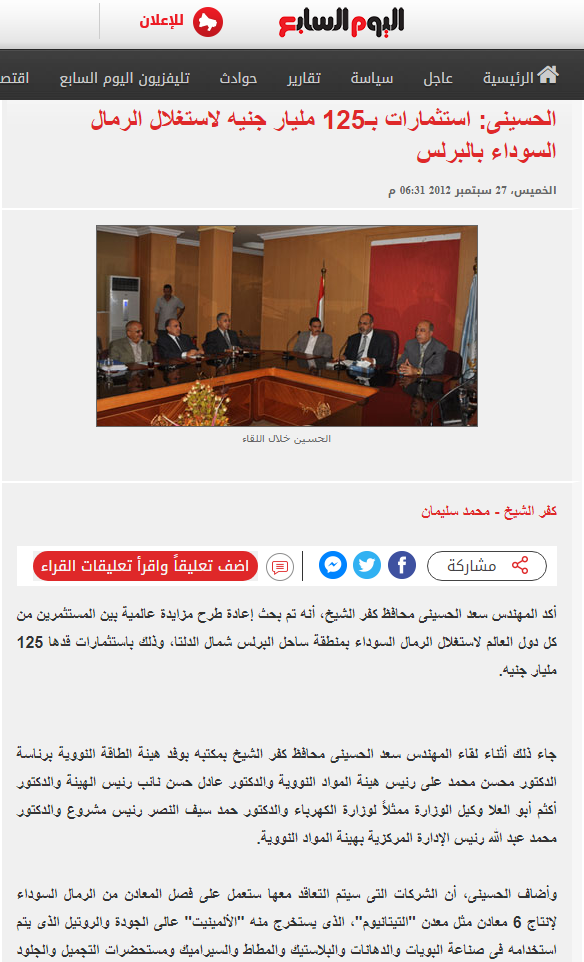 وكانت السلطات المصرية في عهد الرئيس الراحل محمد مرسي، قد شرعت في تنفيذ هذا المشروع (قبل أن ينقلب عليه الجيش في 3 تموز/يوليو 2013 ويستحوذ عليه) عقب إعلان محافظ كفر الشيخ، وعضو المكتب التنفيذي لحزب الحرية والعدالة، سعد الحسيني، المعتقل حاليا، عن طرح مزايدة عالمية لاستغلال الرمال السوداء بمنطقة ساحل البرلس، وذلك باستثمارات قدرها 125 مليار جنيه (كانت تقدر حينها بنحو 21 مليار دولار).