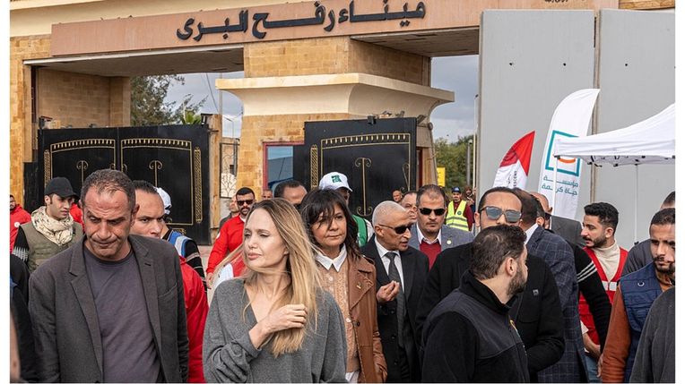 وذكرت وسائل إعلام محلية بأن الممثلة والمبعوثة الخاصة السابقة لمفوضية الأمم المتحدة لشؤون اللاجئين قامت بالزيارة للاطلاع على أوضاع الجرحى الفلسطينيين الذين نُقلوا إلى مصر وعمليات إيصال المساعدات إلى القطاع المدمّر والمحاصر.