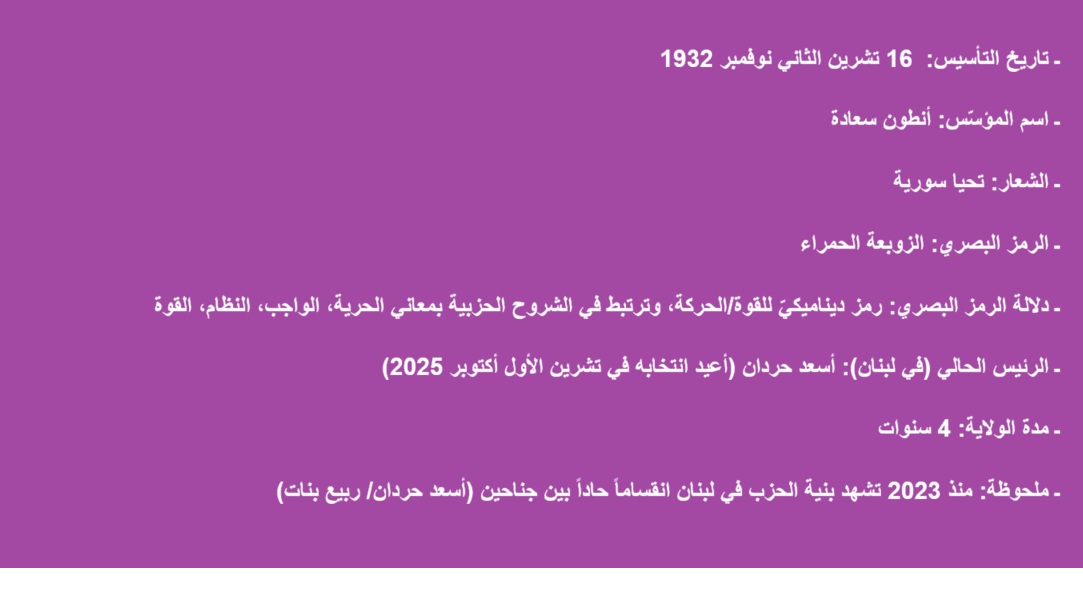ولا يقتصر هدف هذه القراءة على سرد التاريخ، بل على فهم كيفية تشكّل خيارات الحزب ومواقفه، وما الذي بقي ثابتاً في مبادئه وما الذي تبدّل تحت ضغط الوقائع. نخصص هذه الحلقة من سلسلة المقالات للتعرف إلى الحزب السوري القومي الاجتماعي في لبنان، بوصفه أحد أقدم الأحزاب وأكثرها إثارة للجدل في الحياة السياسية اللبنانية.