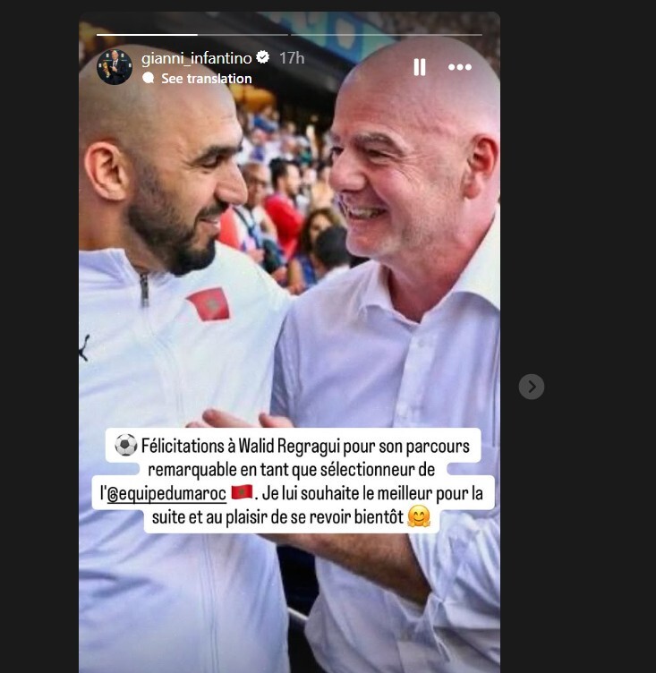 ونشر إنفانتينو عبر حسابه على منصة "إنستغرام" صورة تجمعه بالركراكي، مرفقة بتعليق قال فيه: "تهانينا لوليد الركراكي على مشواره المميز كمدرب للمنتخب المغربي"، متمنياً له التوفيق في مسيرته المقبلة، ومعبّراً عن أمله في لقائه مجددا قريبا.