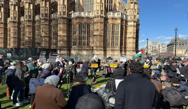 وأصدقائهم، اليوم، أمام مبنى البرلمان البريطاني في العاصمة لندن، في وقفة