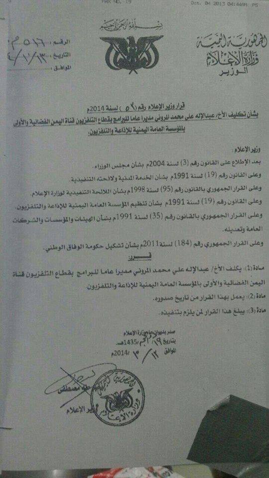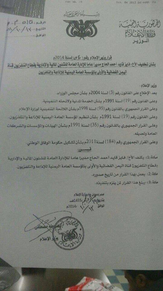 وتبين من وثائق نشرها موقع الكتروني يمني أن الوزير أصدر قرارات بتعيينات جديدة يوم الاثنين 13 تشرين أول/ أكتوبر الحالي لمجموعة جديدة من الاعلاميين والاداريين، وجميعهم من المنتمين لجماعة "أنصار الله" الحوثية، لتكون الجماعة بذلك قد سيطرت على وسائل الاعلام في آخر تطور لها.
