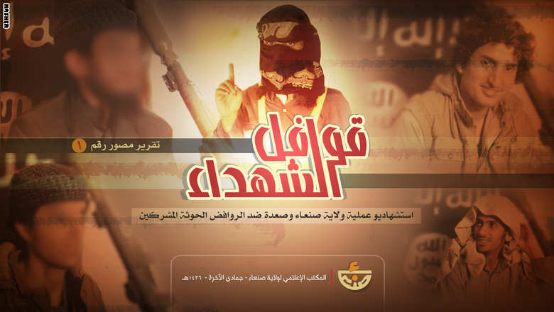 وفي صورة الغلاف للتقرير المصور الذي نشره موقع دأب على نشر مواد للتنظيم، ظهرت صور الأشخاص الخمسة، مع عنوان "قوافل الشهداء" وعبارة "استشهاديو عملية ولاية صنعاء وصعدة ضد الروافض الحوثة المشركين."