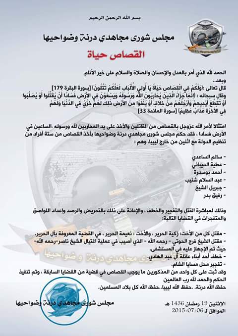 أعلن مجلس شورى مجاهدي درنة وضواحيها الاثنين عن تنفيذ حكم "القصاص" في ستة عناصر ليبيين من تنظيم الدولة، إضافة إلى أجنبيين من عناصر التنظيم في المدينة، لاتهامهم بارتكاب جرائم تراوحت بين القتل وتفخيخ السيارات بهدف تفجيرها، والخطف.