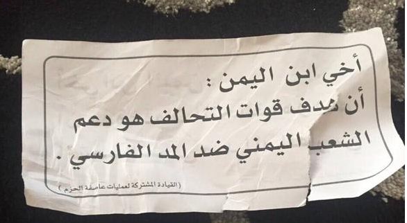 وأوضح المصد الأمني أن الصاروخ يحمل منشورات ورقية تقول: "أنا يمني الأصل، وفي قلبي وطن، أنا سيف صنعاء، وأنا خنجر عدن، لا مكان للفرس وأذنابهم بيننا"، إضافة إلى منشورات أخرى.