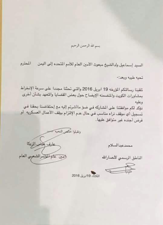 وجاء في الرسالة التي ذيلت بأسماء رئيسي الوفدين التابعين لجماعة الحوثي وحزب المؤتمر الشعبي العام الذي يرأسه الرئيس اليمني السابق المخلوع علي صالح، ووجهت إلى المبعوث الأممي: "تلقينا رسالتكم المؤرخة 19 أبريل 2016، التي تحثنا على سرعة الانخراط بمشاورات الكويت، والمتضمنة الإيضاح حول بعض القضايا، والتعهد بشأن أخرى..".