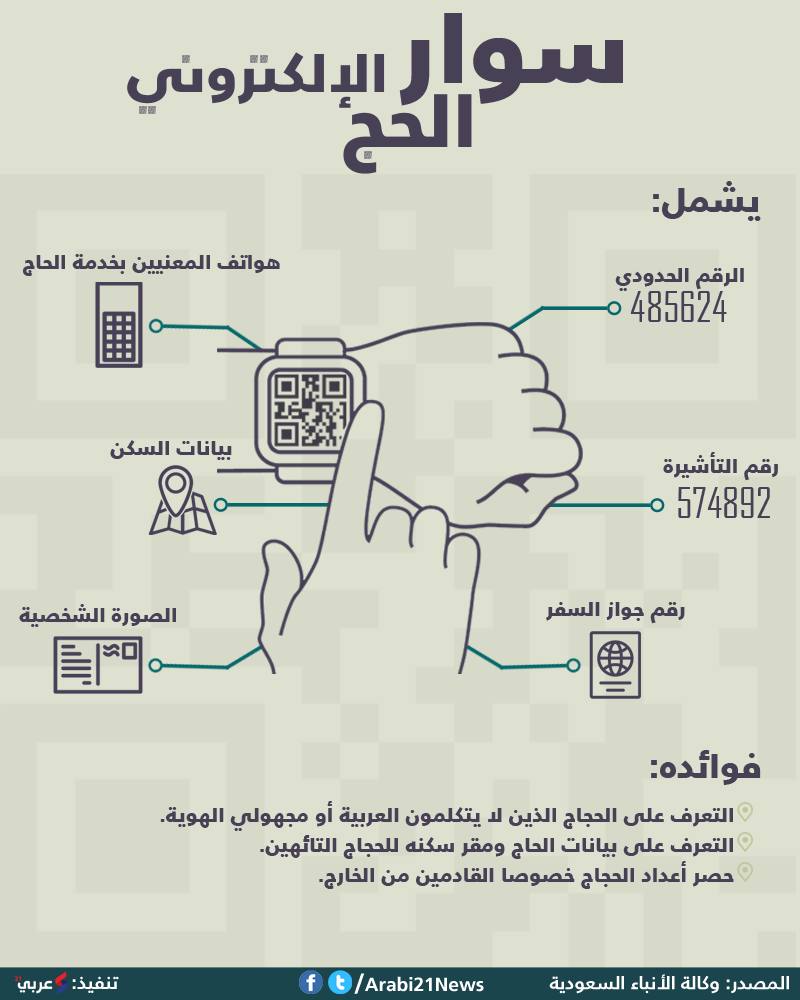 السعودية تزويد الحجاج هذا العام بسوار إلكتروني لسهولة التعرف على الحجاج المفقودين، أو الاتصال بمكان سكنهم في حال تاهوا عنه، أو الأشخاص المسؤولين عنهم كالشركة أو الأقارب.