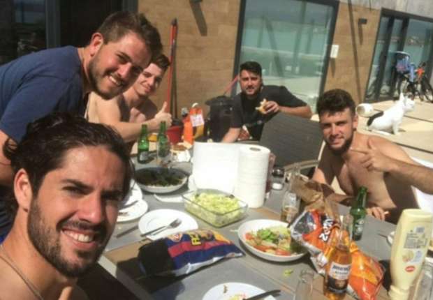 ونشر إيسكو صورة له رفقة أصدقائه وهم جالسون على طاولة يتناولون الطعام، وإلى جانبه كيس للبطاطا يحمل ألوان وشعار نادي